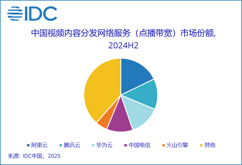 其中视频内容分发网络服务(点播带宽)市场中,阿里云、腾讯云、华为云、中国电信、火山引擎合计市场份额环比提升,本期达到61.5%。