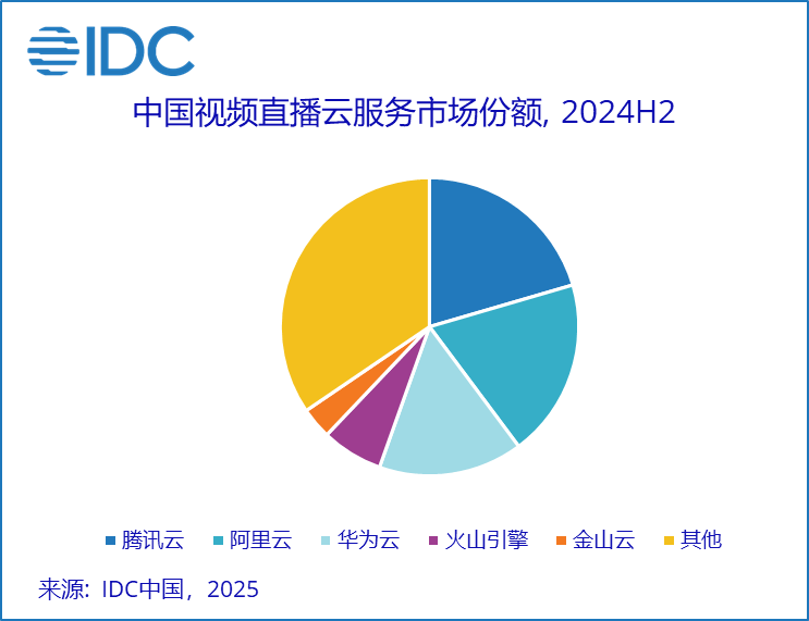其中,视频直播云服务市场中,腾讯云、阿里云、华为云、火山引擎、金山云合计市场份额环比提升,本期达到65.5%。