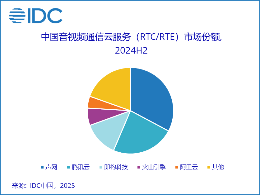 音视频通信云服务市场中,声网、腾讯云、即构科技、火山引擎、阿里云合计市场份额环比持平,为80.4%。