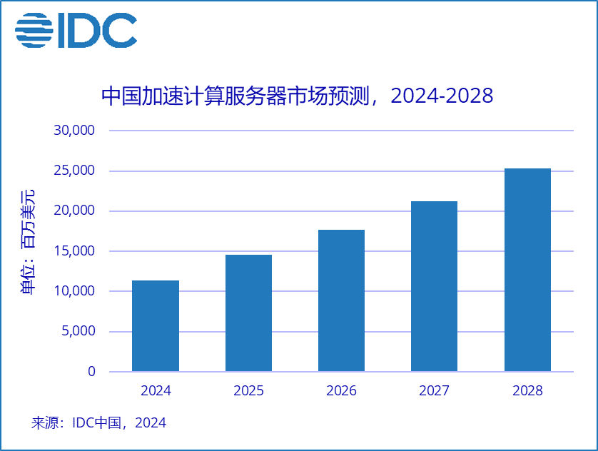从国际环境来看,由于美国对相关技术及产品的管控,一方面限制了中国AI产业的发展;另一方面也激发了中国厂商自研AI芯片的积极性。但同时,国产自研芯片的后期维护与生态支持仍存在提升空间。从市场与产业链角度看,在深入开发行业大模型的当下,市场对于高算力且稳定的AI服务器的需求不断增大;5G通信技术落地之后,市场对于全面高效协同的AI算力系统网络要求加深。这两点趋势在更高算力与更快带宽之外,都对国产AI服务器自身更短的平均故障时间、基础算力配套设施的更全面和运维团队的更专业、覆盖面更广提出了更高要求。IDC预测,到2028年中国加速服务器市场规模将达到253亿美元。其中非GPU服务器市场规模将接近50%。