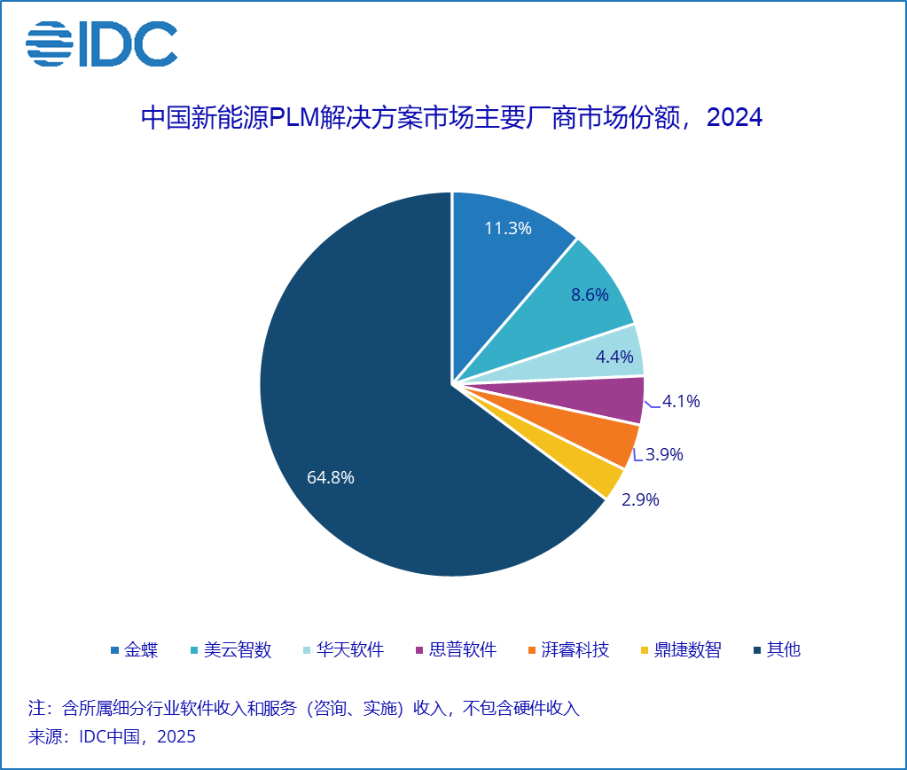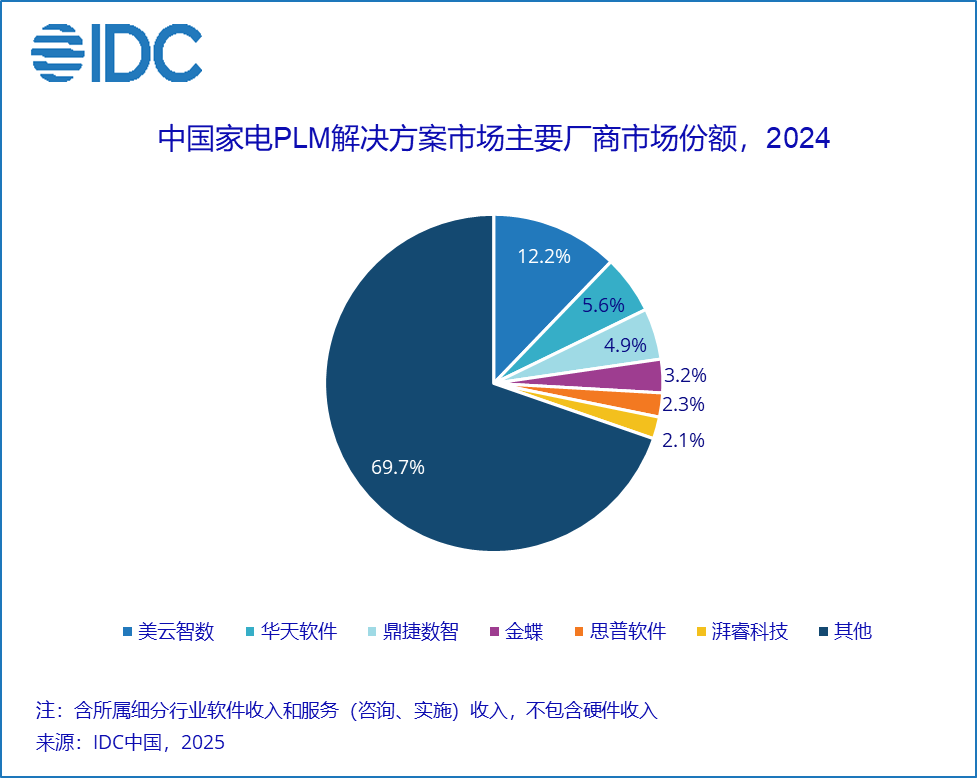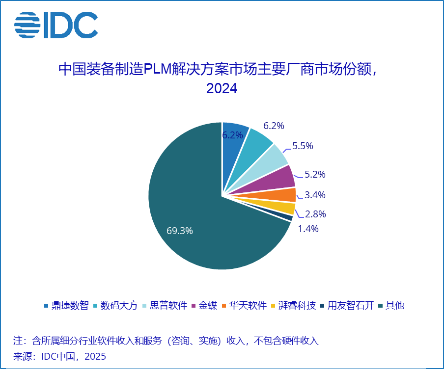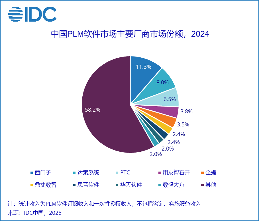 IDC 报告指出,2024年中国PLM软件总市场规模为35.1亿元人民币,年增长率为21.6%,较去年增速回升5.6个百分点。市场增速虽有所回暖,但普遍反馈市场竞争进一步加剧,客单价下降、决策周期变长现象更为普遍。从竞争格局来看,西门子、达索系统和PTC增速持续放缓,但仍然稳居市场前三名。其中,西门子市场份额从2023年的14.3%下降至11.3%,达索系统从10.2%下降至8.0%。用友智石开、金蝶、鼎捷数智、思普软件、华天软件、数码大方分列第四到第九。该市场竞争烈度在短期内并没有缓和趋势,从长期来看,随着中国制造正向研发创新的趋势进一步迈进,以及厂商格局的逐渐清晰,市场会逐渐回归理性。