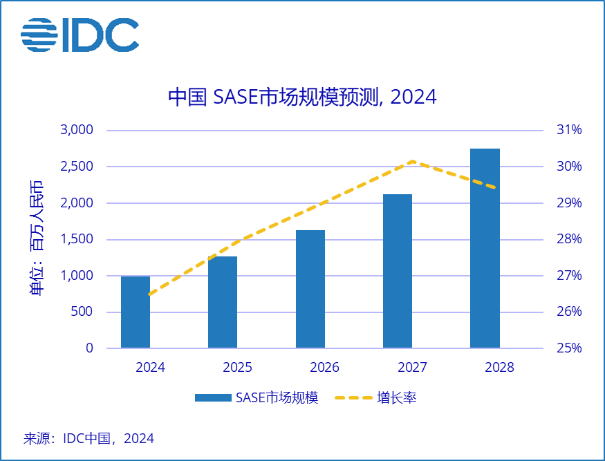根据《IDC China Semiannual SASE Tracker》对SASE市场的跟踪与研究,2024年上半年,中国SASE市场规模约为4.1亿元人民币,预计2024全年市场规模达到约10亿元人民币。SASE 市场正处于蓬勃发展的道路之上,预计未来五年,中国SASE市场的复合增长率将达到28.6%。