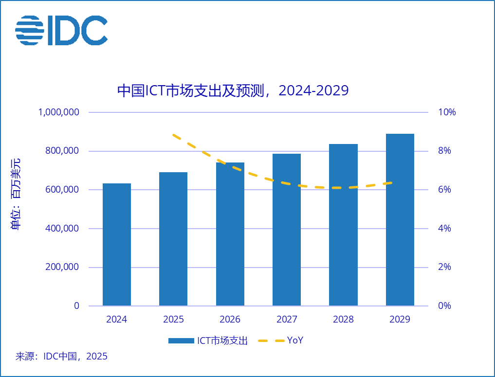 IDC预测,2029年中国ICT市场规模接近8894.3亿美元,五年复合增长率(CAGR)为7.0%。其中,“国补”政策带动消费端产品出货量规模增长,为市场升级提供了空间。
