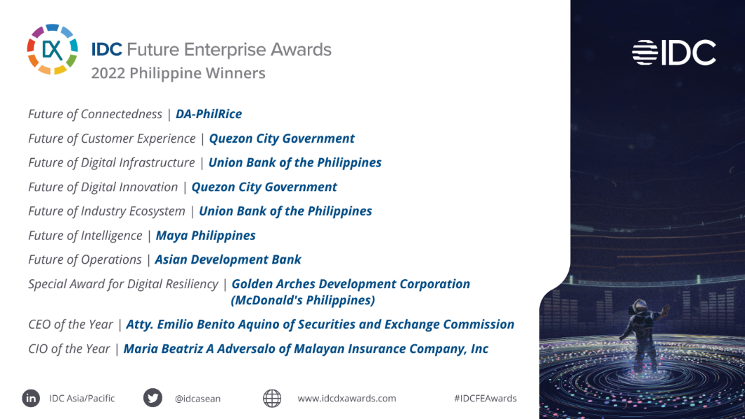 The 2022 Future Enterprise Awards Philippines winners will compete at the regional finals happening at the highly anticipated IDC Asia/Pacific DX Summit and Future Enterprise Awards 2022 on October 26, 2022. To join the annual regional DX Summit, please register HERE.