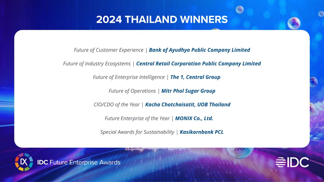 “The 2024 Future Enterprise Awards winners from Thailand highlight how organizations can leverage AI and other innovative digital technologies for enhanced innovation, better customer experience, and successful delivery of environmental, social, and governance promises. Krungsri’s digital wealth platform and MONIX’s AI-powered lending are both great examples of technology used for business value creation and for financial inclusion social outcomes,” says Melvie Espejo, Research Director, IDC Asia/Pacific