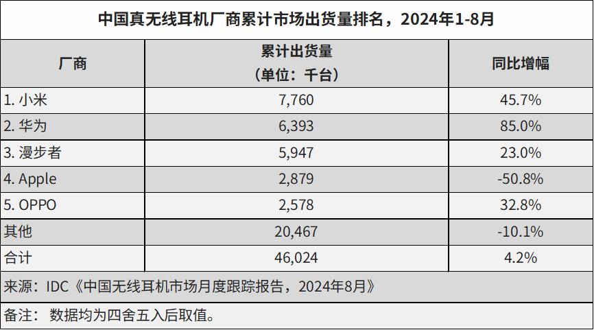 受到真无线整体市场增长乏力及价格不断下探所带来的激烈竞争影响,Apple出货量同比大幅下滑,但其出货额依旧在2024年1-8月真无线市场中累计排名第一,彰显其头部品牌地位。随着9月Apple换代款上市,其蓝牙耳机的市场排名有望得到提升。