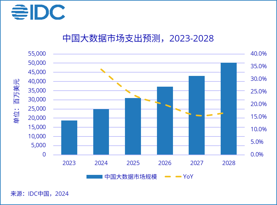聚焦中国市场,IDC预计,2028年中国大数据IT支出规模预计为502.3亿美元,全球占比约8%,五年复合增长率约为21.9%,增速位居全球第一。