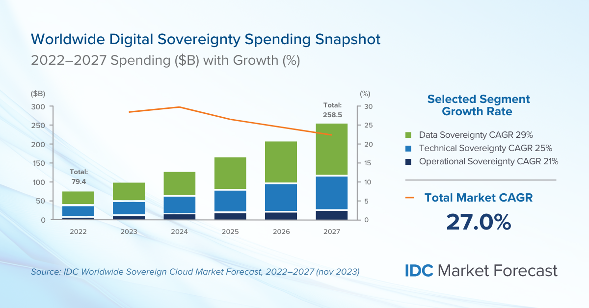In what is believed to be the first study of its kind, the recently published Worldwide Sovereign Cloud Market Forecast, 2022–2027 (IDC #US49695922) unveils that total spending on sovereign cloud is expected to record a compound annual growth rate (CAGR) of 26.6% throughout the forecast period.