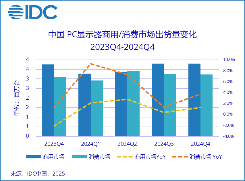 北京,2025年3月20日——国际数据公司(IDC)最新发布的《中国PC显示器市场季度跟踪报告》显示,2024年中国PC 显示器市场总出货量2,705万台,同比增长3.3%。第四季度市场出货量为703万台,同比增长2.4%。其中,商用市场出货量380万台,同比增长1.3%;消费市场出货量323万台,同比增长3.7%。增长的核心驱动力主要得益于消费市场结构的持续升级,以及电竞显示器在普通办公市场中的加速渗透。这一趋势将在2025年继续推动中国显示器市场的发展,预计2025年中国PC显示器出货量将实现1.6%的增长。