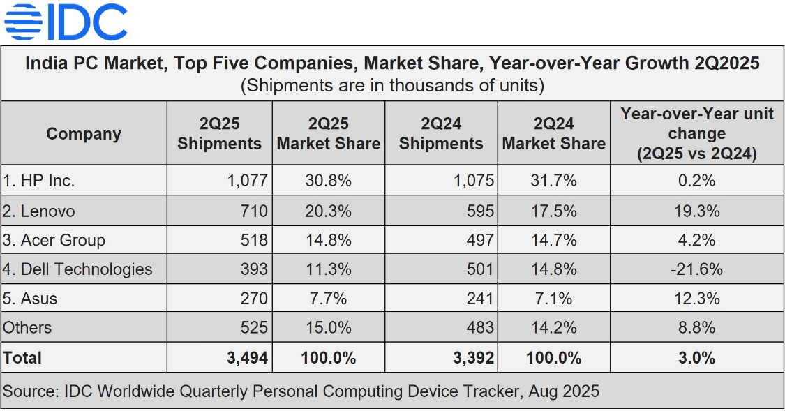 INDIA, August 19, 2025 – India’s traditional PC market (desktops, notebooks, and workstations) grew 3.0% year-over-year (YoY) in 2Q25 with 3.5 million units shipments, according to data from the International Data Corporation (IDC) Worldwide Quarterly Personal Computing Device Tracker. This marks the eighth consecutive quarter of growth.
