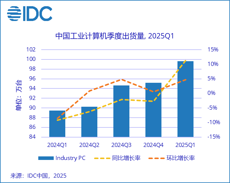 北京,2025年6月20日——近日,国际数据公司(IDC)发布了《2025年第一季度中国工业计算机市场季度跟踪》报告。IDC数据显示,2025年第一季度中国工业计算机出货量达99.6万台,同比增加11.3%。自去年同期出货量收缩以来,中国工业计算机市场出货量已经连续四个季度实现增长。
