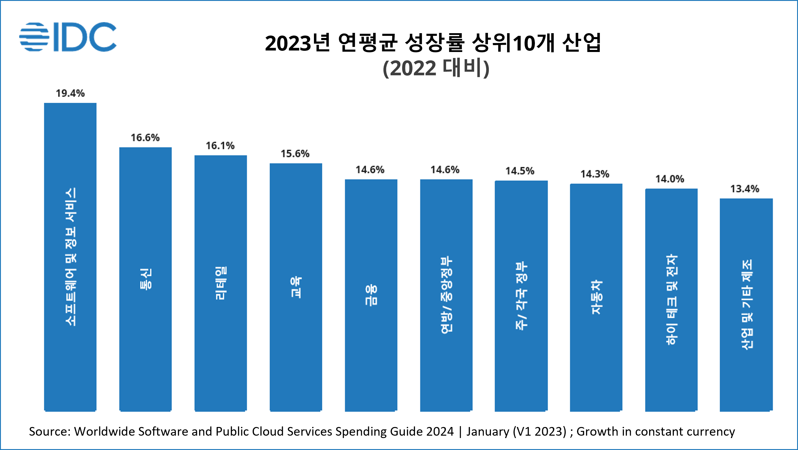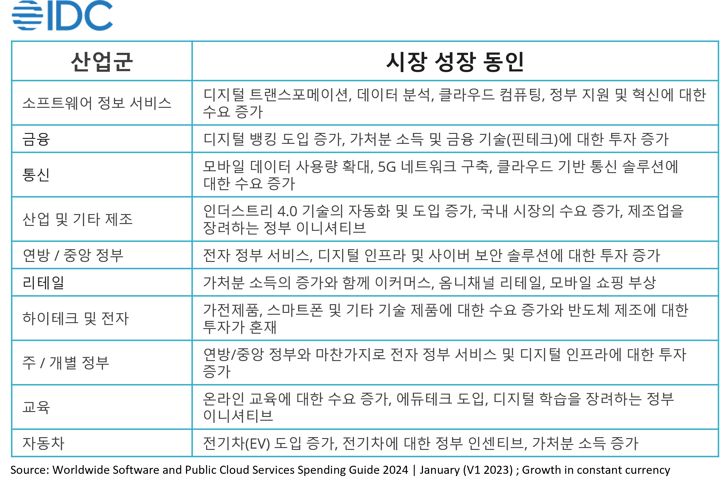 IDC 가 분석한 소프트웨어 및 클라우드 서비스 지출 시장의 60%를 점유하는 상위 10개 산업별 주요 성장 동력은 다음과 같다.
