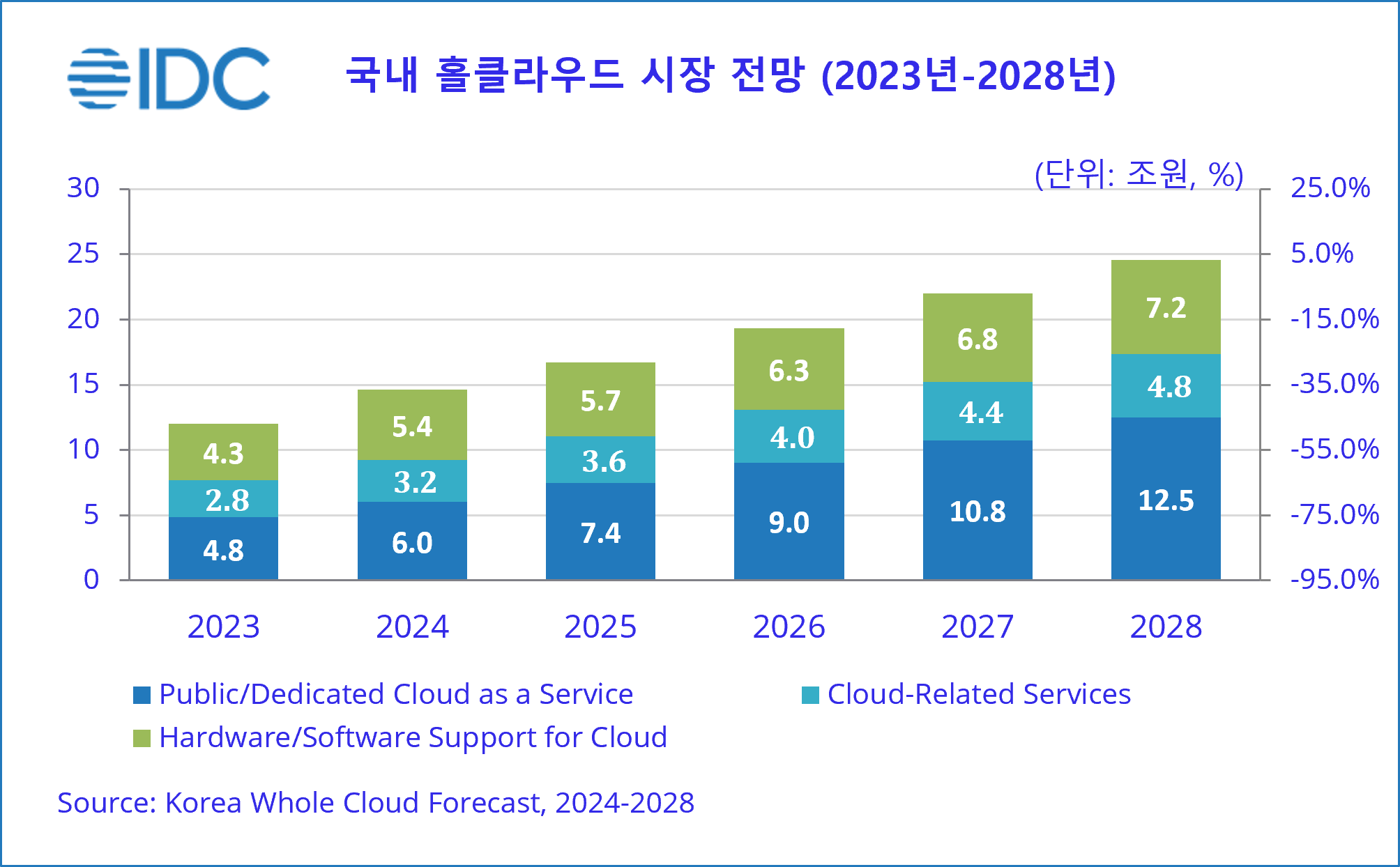 2024년 8 월 29일, 서울 – IT 시장분석 및 컨설팅 기관인 인터내셔날데이터코퍼레이션코리아 (International Data Corporation Korea Ltd., 이하 한국IDC, https://www.idc.com/kr)는 최근 발간한 ‘국내 홀클라우드(Whole Cloud) 시장 전망 2024-2028’보고서에서 2024년 국내 홀클라우드 시장이 전년대비 21.9% 성장하여 약 14.6조 규모를 형성할 것이라고 금일 밝혔다. 기업들의 생성형 AI 도입 움직임이 증가하며 클라우드 기술은 생성형 AI 도입을 위한 전략적 파트너로 자리매김하면서 기반 기술 플랫폼으로서의 도입 확산이 시장 성장을 이끄는 주요 동력으로 분석된다.