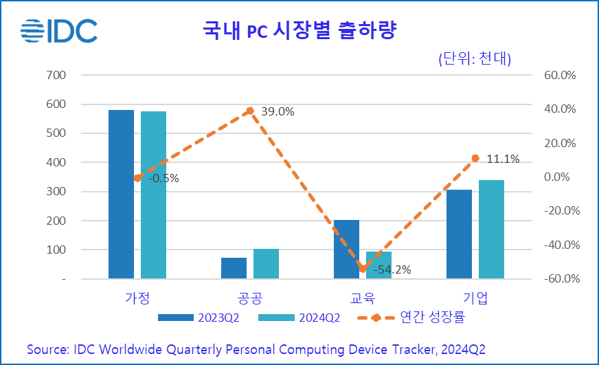 2024년 8월 27일, 서울 – IT 시장분석 및 컨설팅 기관인 인터내셔날데이터코퍼레이션코리아 (International Data Corporation Korea Ltd., 이하 한국IDC, https://www.idc.com/kr)는 최근 발표한 국내 PC 시장 연구 분석에서 2024년 2분기 국내 PC 시장은 전년 대비 4.3% 감소한 111만대를 출하했다고 금일 밝혔다. 같은 기간 전 세계 PC 시장이 1.8% 성장한 것과 대비하여 부진한 회복세다. 국내 PC시장은 디지털 교육 활성화를 위한 노트북 보급 규모가 2분기부터 축소되며 1분기 2.3%성장과는 대비된 역성장으로 전환된 것으로 나타났다. 그러나 시장 정체 속에서도 울트라 슬림, 게이밍, AI PC 등 고가 제품군은 프리미엄을 지향하는 소비층에 소구하며 공급업체의 수익성 확보에 기여한 것으로 분석됐다.