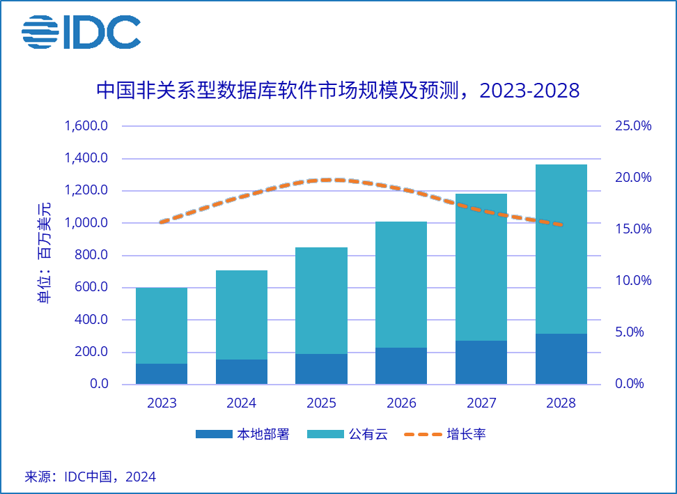 IDC近期发布的《2023年中国非关系型数据库软件市场跟踪报告》显示, 2023年中国非关系型数据库软件市场规模为6.0亿美元,同比增长15.7%,超过同期关系型数据库市场增速。其中,本地部署非关系型数据库规模1.3亿美元,同比增长13.9%;公有云非关系型数据库规模4.7亿美元,同比增长16.2% 。IDC预测, 到2028年,中国非关系型数据库软件市场规模将达到13.6亿美元,2023-2028的5年市场年复合增长率(CAGR)为17.8%。