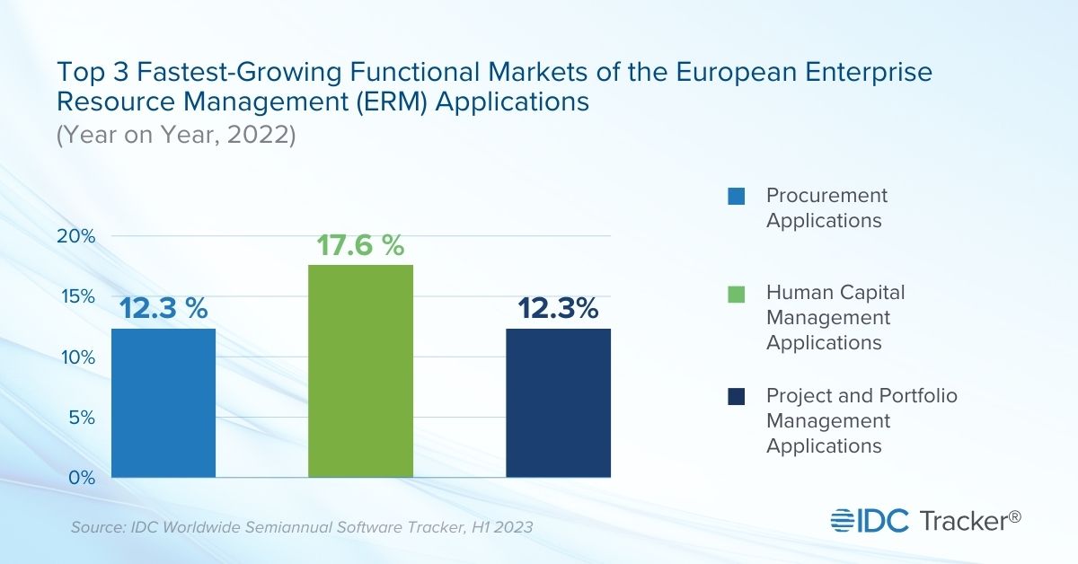Prague, January 30, 2024 — According to the Worldwide Semiannual Software Tracker  published by International Data Corporation (IDC), enterprise resource management (ERM) applications, will record a compound annual growth rate (CAGR) of 10% in Europe between 2023 and 2027. ERM refers to applications designed to automate and optimize business processes related to resources required to meet business or organizational objectives. The fastest-growing segment of this market will be human capital management (HCM) applications, with an expected CAGR of 13.5% for the same forecast period.