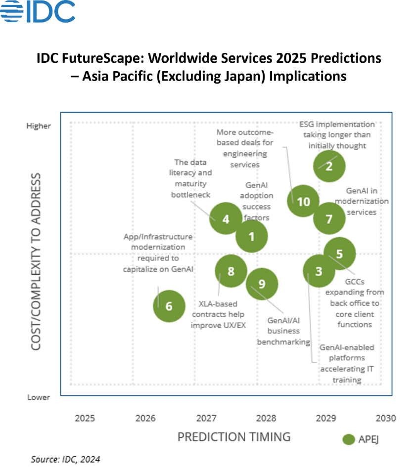This year’s services predictions for APEJ are once again dominated by the influence of AI and generative AI (GenAI), but with more of a focus on driving adoption into production rather than the experimentation observed last year, especially in areas such as skilling, environmental, social, and governance (ESG), data, and application modernization. Below are some of the other key services predictions for the region: