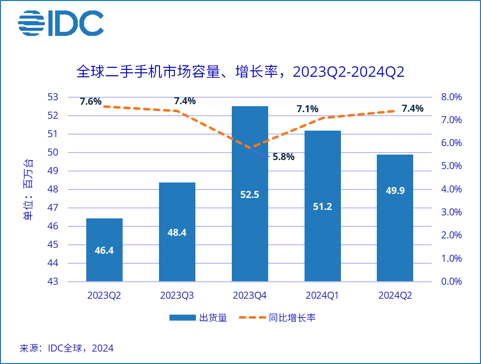 2024年第二季度,全球二手手机市场容量约4,988万台,同比增长7.4%,保持稳定增长势头。二手手机市场的增长证明了二手设备在循环经济和整体智能手机市场中的重要价值。硬件方面,手机耐用性的提升使得二手手机可以保持更好的状态,对未来的转售价值产生了积极影响。软件层面,拥有更长时间操作系统和安全补丁支持的二手手机也更受消费者欢迎。而以旧换新已经成为二手手机的主要供应来源。二手手机市场的存在全球经济不景气导致收入下降的消费者提供了更多选择。