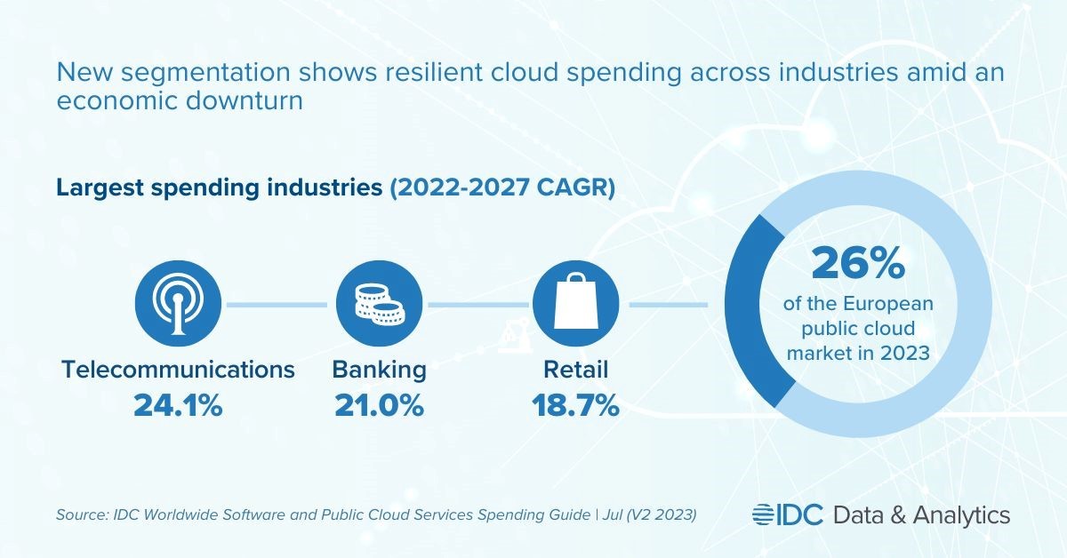 Banking, retail, and telecommunications will be the top spending industries in public cloud in 2023, accounting for 26% of the overall market value. Telecommunications companies have been less impacted by higher energy prices than other industries. Also, debt redemption in the telecom sector remains low, and costs linked to higher interest rates are contained, which creates favorable circumstances for releasing IT budgets. IDC expects public cloud investments in the telecommunications sector to grow strongly in 2024, placing it among the highest-spending industries, along with life sciences, utilities, and healthcare payer.