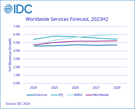 NEEDHAM, Mass. April 30, 2024 – The global IT and Business Services market witnessed some softening in 2023 with revenue growing (in constant currency) from $1.17 trillion in 2022 to $1.22 trillion, according to the International Data Corporation (IDC) Worldwide Semiannual Services Tracker. This translates to year-over-year growth of 4.6%, which slightly outperformed IDC’s forecast of 4.5% growth. In nominal dollar denominated revenue based on today’s exchange rate, the market grew 4.1%.