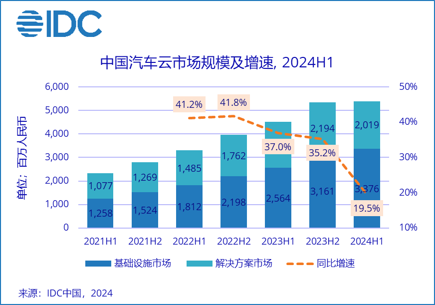 北京,2024年10月15日——国际数据公司 (IDC)最新发布的《中国汽车云市场(2024上半年)跟踪》报告显示,2024上半年中国汽车云市场整体规模达到53.9亿元人民币,同比增长19.5%。其中基础设施市场规模为33.8亿元人民币,同比增长31.7%;解决方案市场规模为20.2亿元人民币,同比增长3.4%。