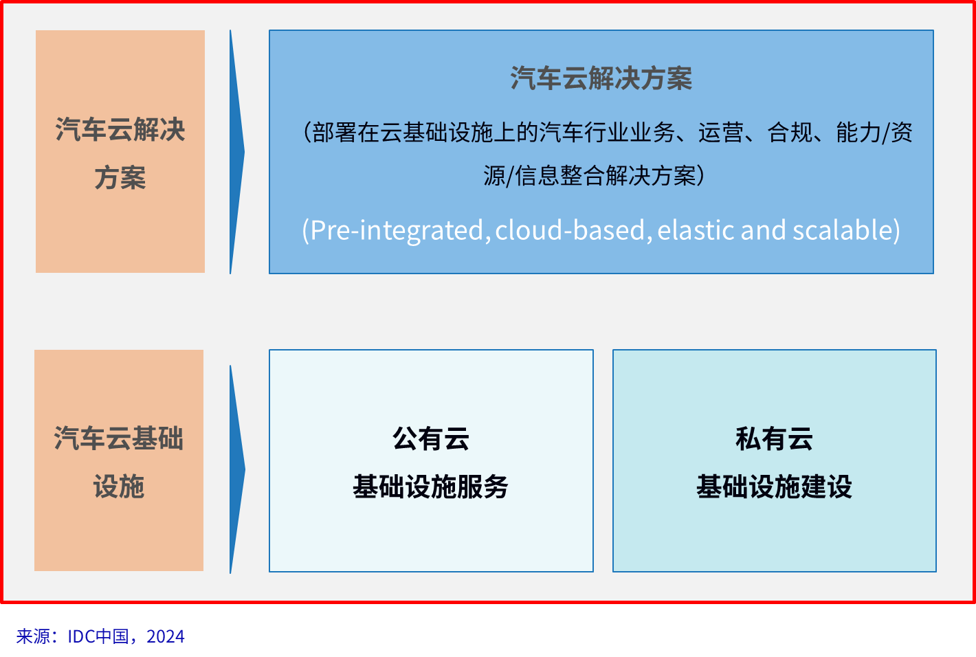 IDC定义的汽车云是指为了满足汽车行业(包括汽车行业供应商、主机厂、以及应用智能汽车的行业用户)数字化、智能化转型的云计算基础设施和解决方案(包括平台和应用)。云计算基础设施包括公有云和私有云基础设施,解决方案包括“业务系统云化”、“车载物联网”、“自动驾驶开发”、“车路协同&其他出行服务”四个赛道。