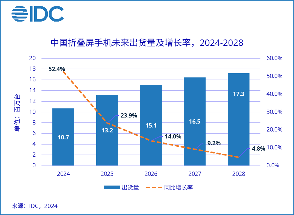 北京,2024年9月11日——国际数据公司(IDC)发布的最新手机季度预测报告显示,预计2024年中国折叠屏手机市场出货量约1,068万台,同比增长52.4%;至2028年,中国折叠屏手机出货量将会超过1,700万台,五年复合增长率达到19.8%。