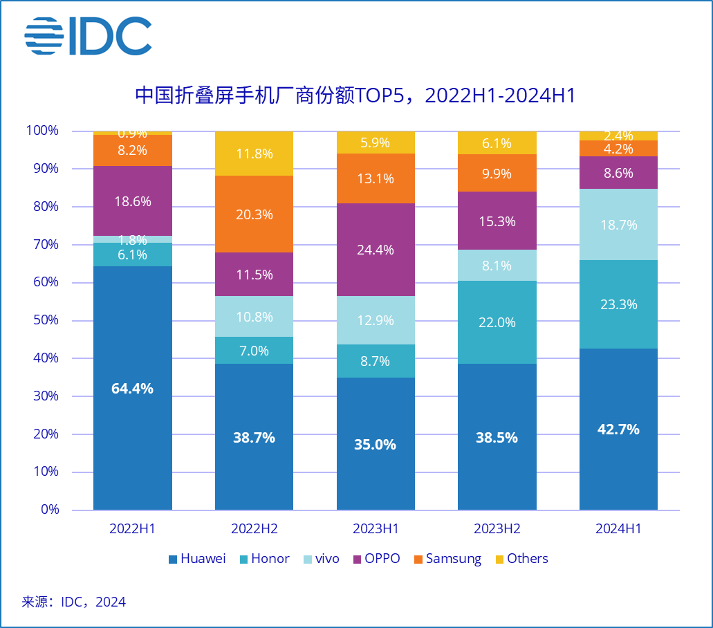 华为一直都是中国折叠屏手机市场的重要参与者,不管是从产品形态、产业链技术还是系统应用的适配,始终引领折叠屏手机行业的发展,从2020年开始,市场份额一直超过三分之一;荣耀和vivo凭借新产品在“轻薄”和“全能”上的成功打造,今年上半年市场份额分别达到23.3%和18.7%;OPPO在今年没有新产品上市的情况下依然位居第四位,市场份额8.6%;三星折叠屏产品受到来自中国品牌的竞争压力较大,市场份额只有4.2%。