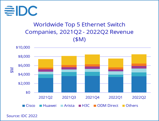 NEEDHAM, Mass., September 8, 2022 – The worldwide Ethernet switch market grew 14.6% year over year in the second quarter of 2022 (2Q22) with revenues of $8.5 billion. The total worldwide enterprise and service provider (SP) router market recorded $4.2 billion in revenue in 2Q22, a 6.3% year-over-year increase. These growth rates are according to results published in the International Data Corporation (IDC) Worldwide Quarterly Ethernet Switch Tracker and Worldwide Quarterly Router Tracker.