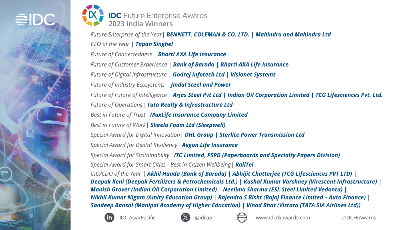 India winners for the 2023 Future Enterprise Awards were announced in Gurgaon, India on 15 December 2023 during IDC DX Summit, while the regional winners were announced during IDC’s Future Enterprise Summit and Awards at the Suntec Singapore Convention and Exhibition Centre on 31 October 2023. To learn more about the regional winners, click HERE.