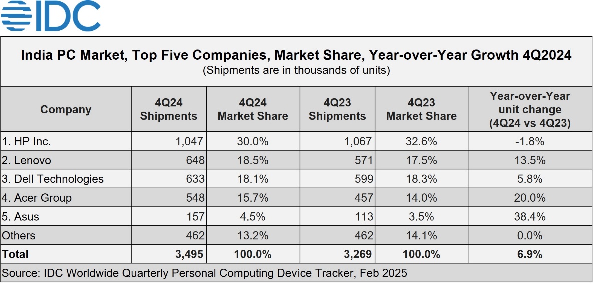 Dell Technologies was third with a 16.1% share in 2024. It continued to hold the second position in the commercial segment with 21% share on the back of the enterprise and SMB segments. However, it dropped to fifth position behind Acer in the consumer segment with 3.9% YoY growth.
