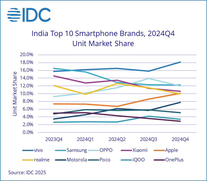 Overall, vivo surpassed Samsung for the leadership position in 2024, with its consistent omnichannel play, diversified portfolio across price segments and channel support. Nothing registered the highest growth overall, followed by Motorola and iQOO annually. The long tail of brands collectively gained ground in 2024, as the share of the top five vendors depleted from 76%, 68%, and 65% in 2022, 2023, and 2024 respectively.