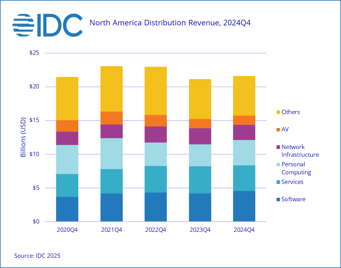 NEEDHAM, Mass., Jan. 29, 2025 – In the fourth quarter of 2024,  Distributor Revenues grew 2.3% year-over-year, landing at $21.4 B, but this solid end to the year was not enough to outweigh weaker sales in earlier quarters, and 2024 ended down 1.1% year-over-year according to the International Data Corporation (IDCNorth America Distribution Tracker   (NADT). Product groups driving growth in Q4 included Software coming in at 9.7% year-over-year and Personal Computing which beat expectations and grew an impressive 16.2% year-over-year. The performance in these categories was enough to offset a year-over-year decline in Services of -5.5% and the anticipated decline in Network Infrastructure of -6.0% year-over-year.