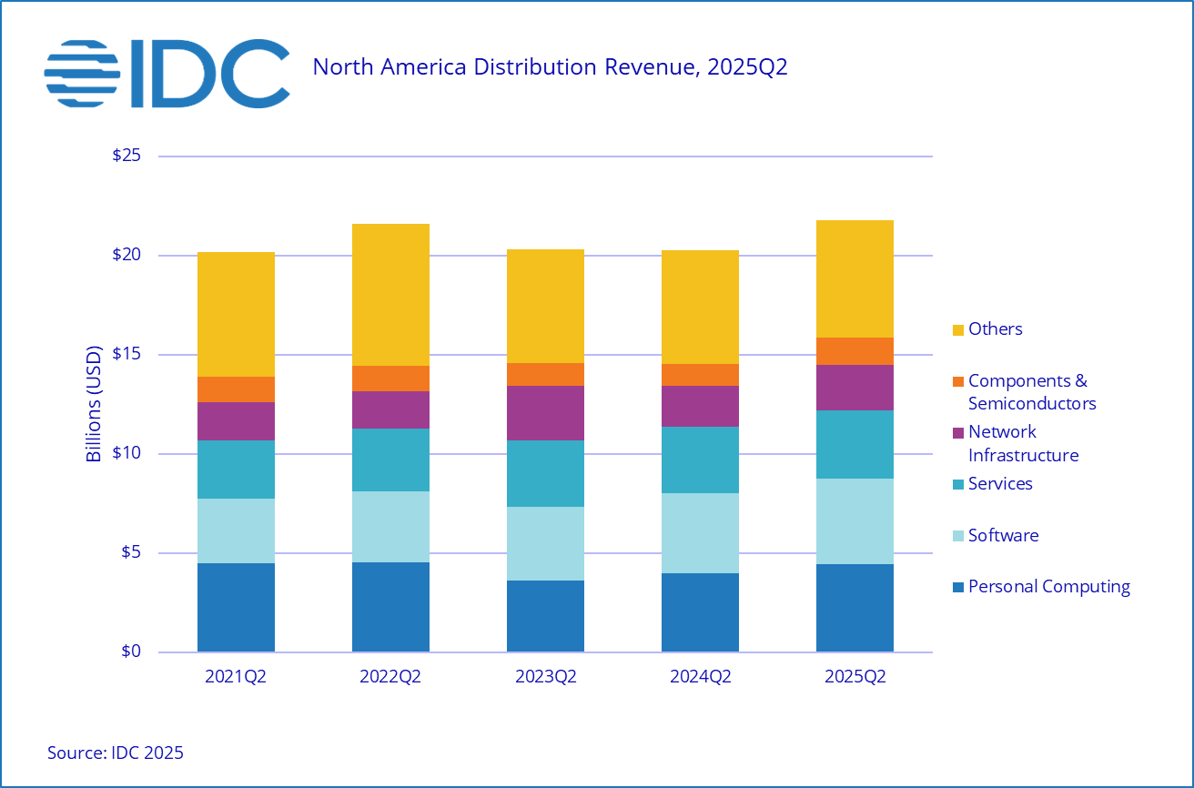 NEEDHAM, Mass., July 29, 2025 – The IT distribution channel in North America posted record high sales in the second quarter of 2025, surpassing the previous Q2 high seen during the pandemic. Distributor Revenues came in at $21.8B which is a 7.4% increase year-over-year, according to the International Data Corporation (IDC) North America Distribution Tracker (NADT). All the largest categories grew in Q2 with hardware categories exhibiting the strongest growth; Personal Computing grew 12.1% year-over-year, Network Infrastructure grew 13.3% year-over-year and for the first time, Components & Semiconductors joined the top five product groups after recording 22.9% year-over-year growth. This growth for Components & Semiconductors is driven by a huge increase in sales through distribution of GPUs.