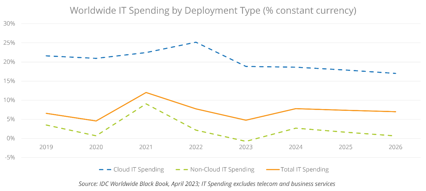 While software and services spending continue to grow, this contrasts with a significant pullback in capital spending on hardware and equipment, as interest rates begin to have a direct impact on financing while recent turmoil in the banking sector has added to a general sense of economic uncertainty.