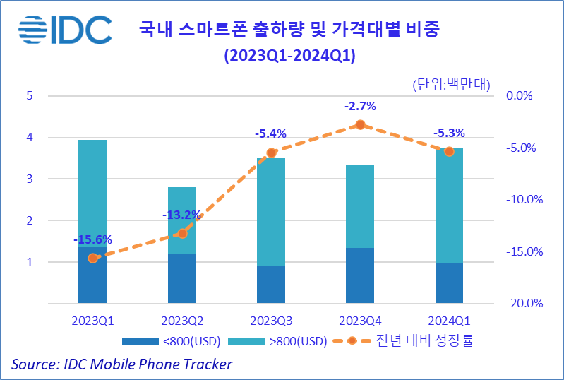 2024년 6 월 19일, 서울 – IT 시장분석 및 컨설팅 기관인 인터내셔날데이터코퍼레이션코리아 (International Data Corporation Korea Ltd., 이하 한국IDC, https://www.idc.com/kr)는 2024년 1분기 국내 스마트폰 시장의 출하량은 약 373만대로 전년 대비 5.3% 감소했다고 금일 밝혔다. 국내외 경제 불확실성과 신규 스마트폰 가격 인플레이션, 일명 폰플레이션(스마트폰+인플레이션)으로 사용자의 기존 제품 사용 주기 및 중고 스마트폰 수요가 증가하는 추세다. 이는 신규 스마트폰 수요 감소로 이어져 전체 시장 감소세에도 영향을 미친 것으로 분석된다.