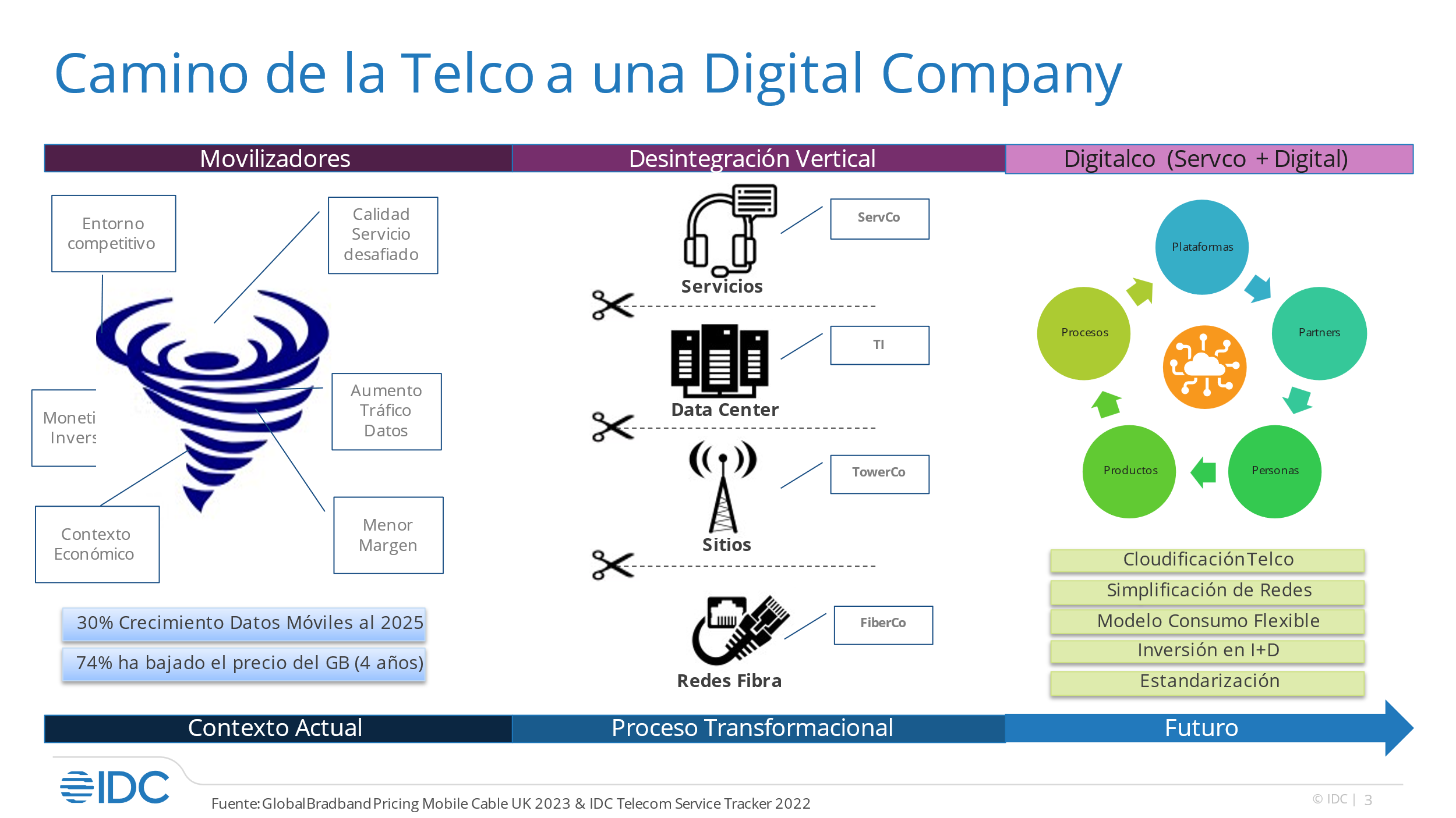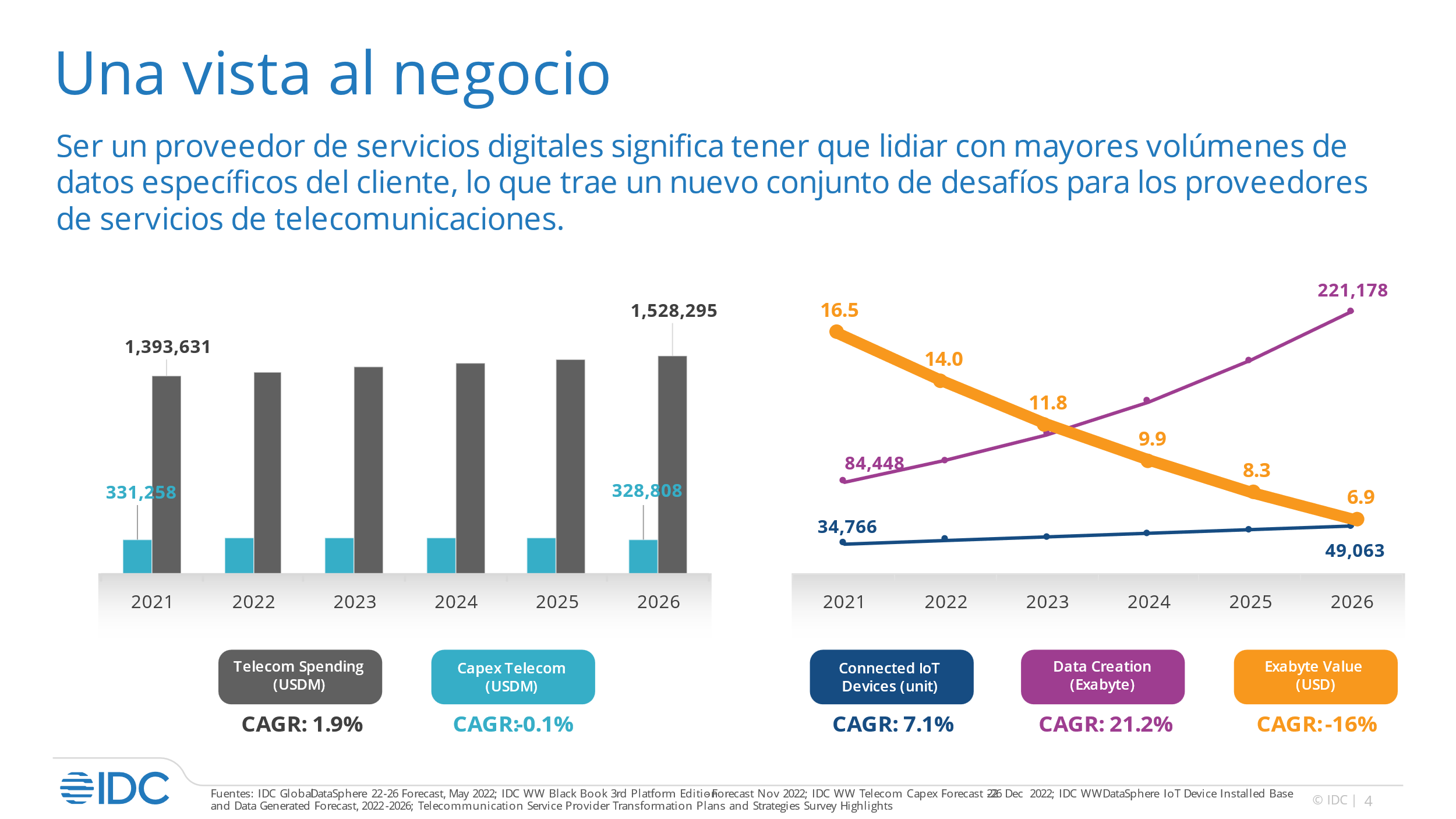 CDMX, 23 de mayo 2023 – El mercado de telecomunicaciones tendrá una mayor transformación, al pasar de ser un proveedor de infraestructura de telecomunicaciones, a una empresa de servicios digitales. Así lo considera IDC, principal firma mundial de inteligencia de mercado, servicios de consultoría, y eventos para los mercados TIC, con base en un análisis realizado al área de telecomunicaciones, en el cual se describe que las telco deberán ofrecer transformación y servicios en los próximos años. Ejemplo de ello es la potencialidad del manejo de datos que se requieren por cada usuario, en los últimos 4 años el costo del gigabyte ha ido a la baja en casi 74% de forma gradual.