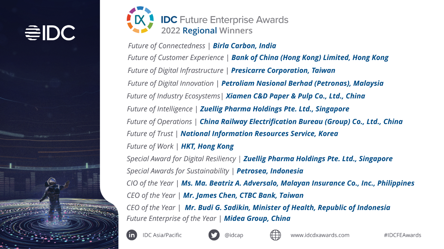 The winners were announced during the IDC DX Summit in Singapore held on October 26, 2022. At the event, business and IT leaders, and even artists, came together to discuss future-forward practices such as: moving from digital transformation to digital business; sustainable practices in the future of work; connected data; the role of Gen Z in the future of the marketplace; advantages of 5G deployment; a patient-focused health ecosystem; the marriage of art and technology; and more.