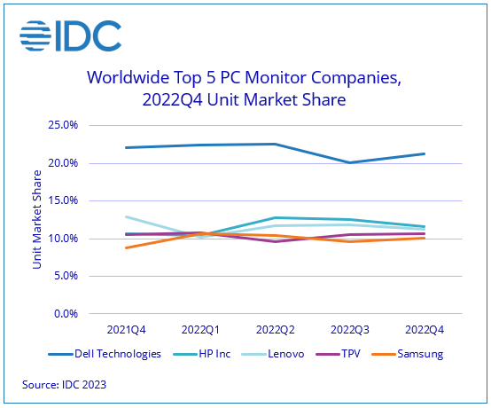 NEEDHAM, Mass., March 17, 2023 – Along with the struggling PC market, PC monitor shipments contracted 18.3% year over year in the fourth quarter of 2022 (4Q22) leading to an annual decline of 5.9% for the full year 2022, according to the International Data Corporation (IDC) Worldwide Quarterly PC Monitor Tracker. At just over 30.5 million units, the 4Q22 results marked the lowest fourth quarter volume since IDC began tracking the market in 2008. However, the setback was expected due to the challenging macro environment, which hit both consumer and commercial demand, and the results hewed close to the forecast of a 16.2% decline in fourth quarter shipments.
