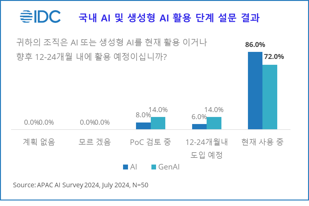 보고서에 포함된 아시아 태평양 지역 조직의 생성형 AI 도입 현황 설문에 따르면 한국 조직의 72%가 생성형 AI를 이미 ‘현재 사용 중’이며 이는 AP 지역 평균인 59.5%보다 12.5% 포인트 높은 도입률이다. 또한 한국 조직의 47.2%는 2024년에 10개 이상의 생성형 AI 유즈케이스를 배포할 예정이며, 2025년에는 48%의 한국 조직이 50개 이상의 생성형 AI 유즈케이스를 배포할 계획이라고 응답했다. 특히, 아시아 태평양 지역 조직의 69.6%, 한국 조직의 78%가 생성형 AI 도입으로 인해 직원 생산성이 개선되었다고 평가함에 따라, 향후 엔터프라이즈 생성형 AI 도입이 더 가속화될 것으로 IDC는 전망했다.