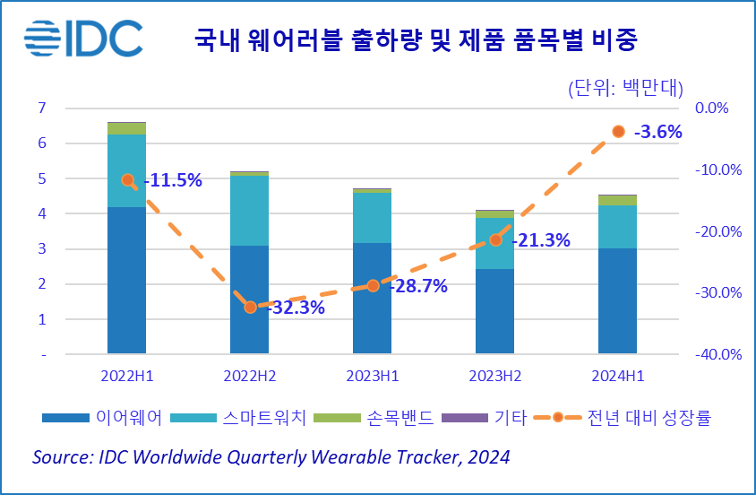 한국 IDC에서 웨어러블 시장 리서치를 담당하고 있는 강지해 연구원은 “엔데믹 이후 감소세가 다소 완만해지면서 2024년 하반기 국내 웨어러블 시장의 출하량은 약 525만대를 기록할 것으로 전망된다”며 “주요 제조사에서 출시하는 다양한 가격대의 신제품 및 신규 폼팩터, 교체주기가 도래한 기존 사용자의 교체 수요, 소프트웨어 업데이트를 통한 추가 기술 적용 등의 요인이 맞물려 시장 수요를 진작하고 향후 웨어러블 시장 성장세에 힘을 보탤 주요 동인으로 작용할 것으로 예상된다”고 언급했다.