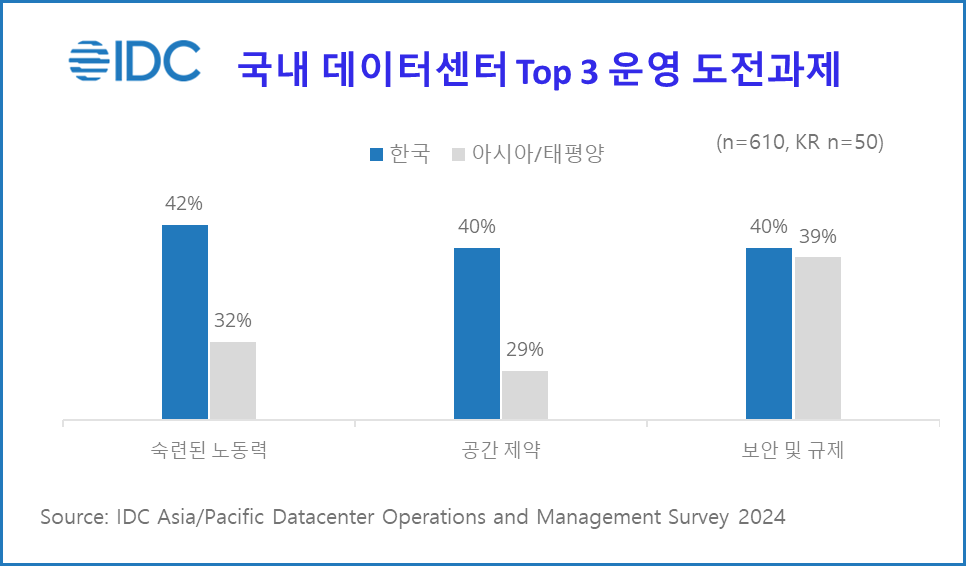 한편 ‘공간 제약’에 대한 응답도 아시아 태평양 지역과 비교해 높은 차이를 보이며40%에 달하는 것으로 조사됐다. 이는 데이터센터의 수도권 집중 현상으로 인해 전력 및 부지 확보가 어려워지며 공간제약 문제가 증가하고 있음을 나타낸다. 현재 국내 데이터센터의 약 58%가 서울 및 경기/인천 지역에 집중되어 있어 수도권 과밀 현상이 심각한 가운데 이를 완화하기 위해 최근 도입된 ‘분산 에너지 활성화 특별법’ 이 시행 중이다. 수도권 외 지역에 전력 요금 할인 및 인프라 지원을 제공하여 데이터센터의 지방 분산을 촉진하는 것이 궁극적 목표이나, 이로 인해 데이터센터 건설 승인 절차가 복잡해져 기업들의 공간 및 전력 확보의 어려움은 가중될 것으로 IDC는 분석했다.