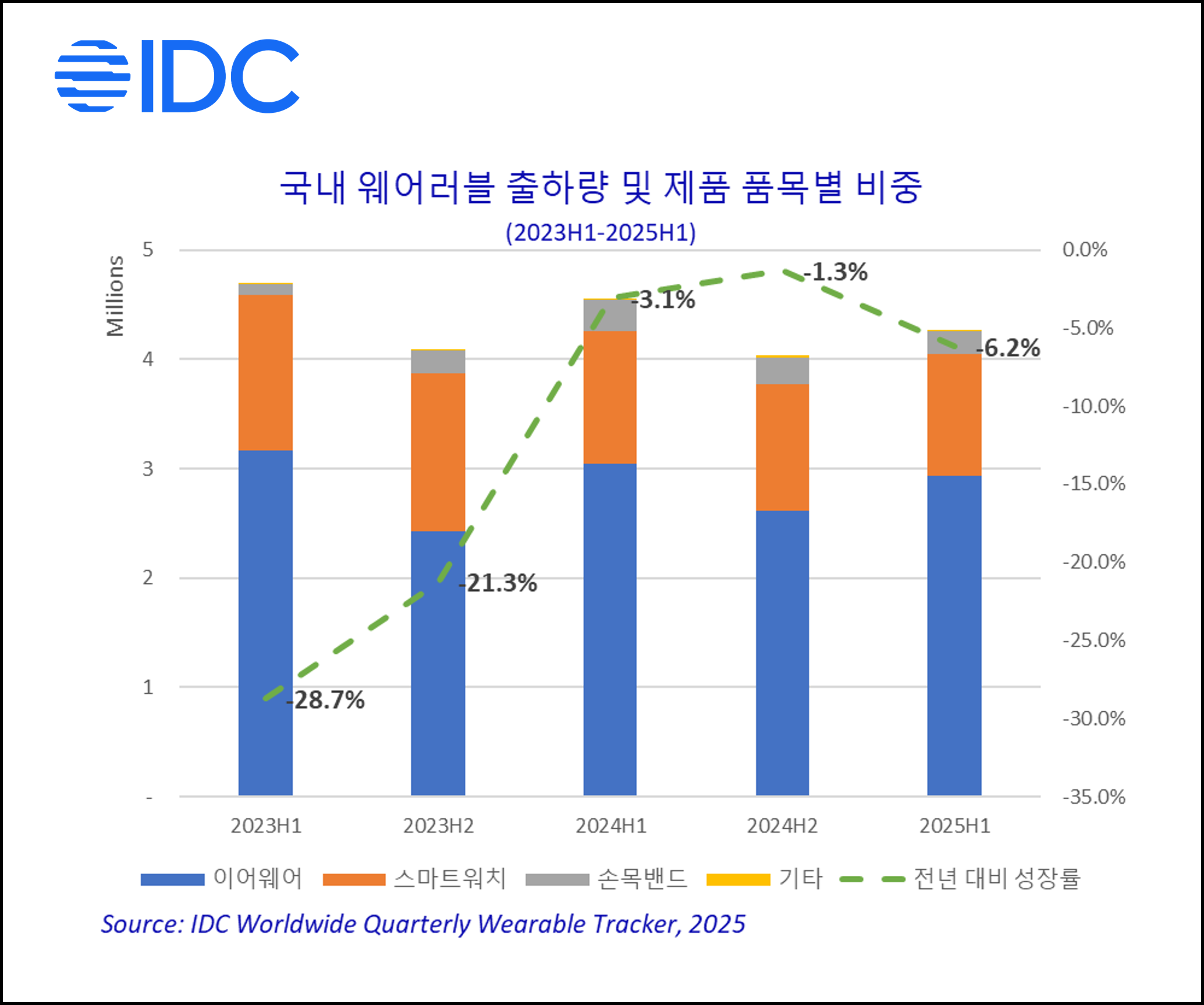 - 경기 불확실성 지속 및 디바이스 구매 우선 순위 변동으로 국내 웨어러블 시장 출하량 감소세