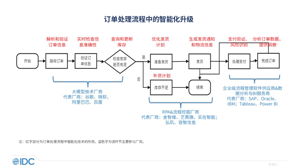 IDC《大模型时代下的企业流程智能变革》报告则聚焦大模型在企业流程中的实际应用。传统企业运营流程受限于人工密集型作业、低效的信息流转以及决策的滞后性,难以适应快节奏的市场变化。因此,需要借助现代技术如大模型,对整体流程进行根本性的改造与优化。企业流程智能化的关键要素包括数据集成与分析、自动化与RPA技术、AI与大模型的集成以及实时监控与优化。通过构建统一的数据平台、整合来自不同系统的数据、使用RPA技术自动化执行重复性任务、引入AI算法提升流程的智能决策能力,并设置实时监控系统持续优化流程,企业可以实现运营效率的提升、决策能力的增强以及资源的优化配置。以商品订单处理流程为例,大模型能够渗透流程的各个环节,包括解析验证、订单信息的实时监测更新等,从而端到端地提升流程整体的流畅度与销售灵活度。