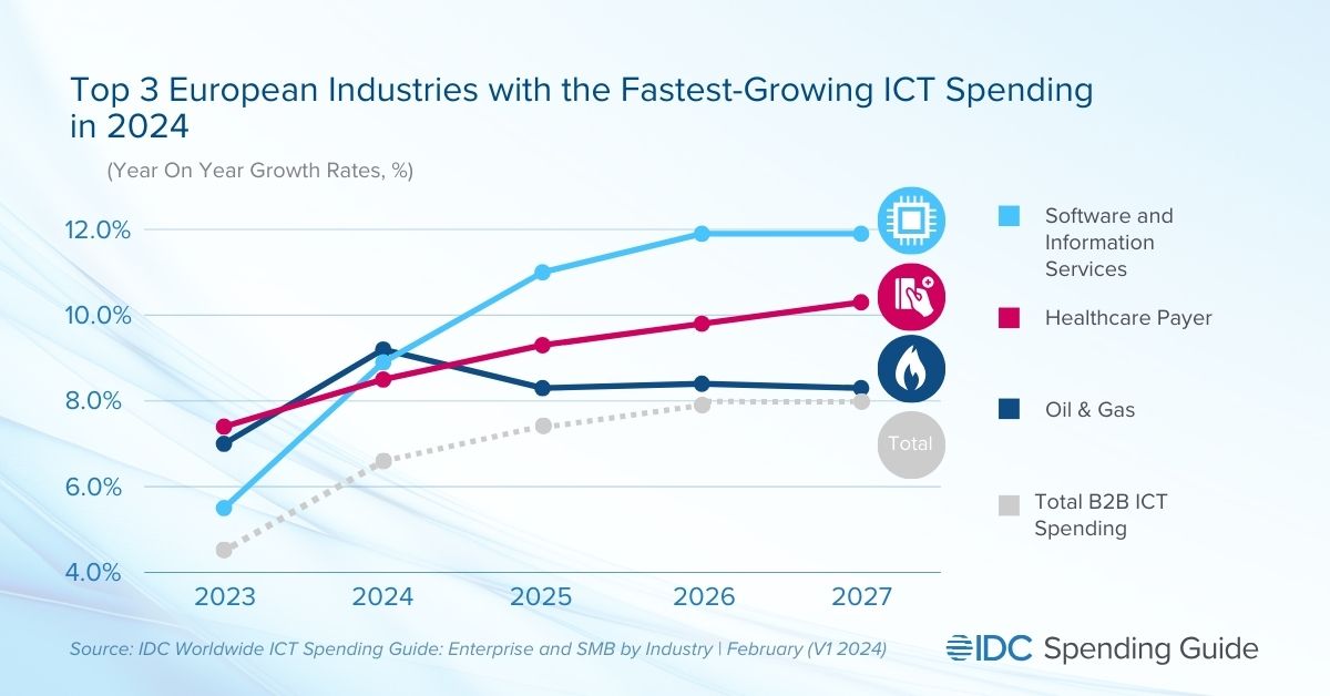 In the commercial segment, the oil & gas, software and information services, and healthcare payer industries will post combined year on year spending growth of 9% in 2024, exceeding total B2B ICT spending growth of 6.6%. The energy sector will present one of the highest growth rates of ICT spending this year, as the diversification of energy sources and compliance with environmental and sustainability-related regulations will require upgrades in digital capabilities.