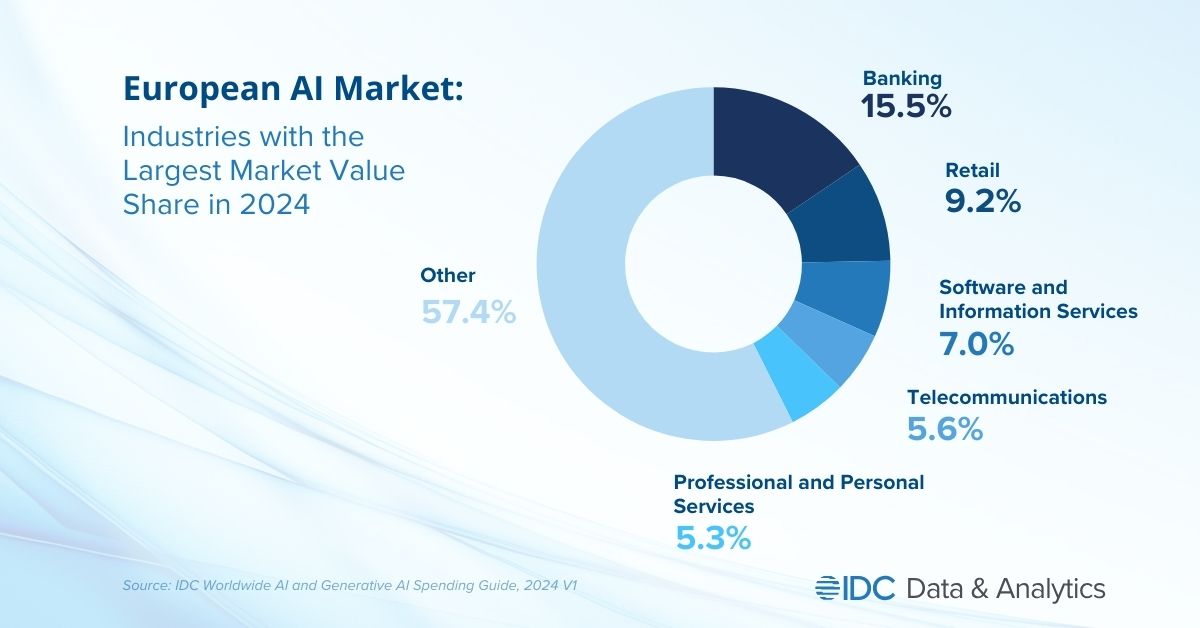 MILAN, March 21, 2024 — According to the latest release of the Worldwide AI and Generative AI Spending Guide (v1 2024) published by International Data Corporation (IDC), the European AI and generative AI (GenAI) market will reach almost $47.6 billion in 2024 and record a compound annual growth rate (CAGR) of 33.7% over the 2022-2027 forecast period. Europe represents around one-fifth of the global AI market.