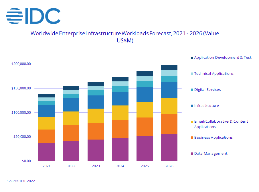 In 2022, the Data Management workload category, which includes five workloads – AI Lifecycle, Business Intelligence and Analytics, Structured Database/Data Management, Text and Media Analytics, and Unstructured Database – will be the largest with $41.1 billion in spending on compute and storage infrastructure products. It will remain the largest throughout the forecast period with a five-year compound annual growth rate (CAGR) of 9% and reaching $56.3 billion in infrastructure spending in 2026. Most of the growth in this category will come from the fastest growing workloads related to unstructured data and artificial intelligence.