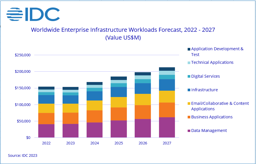 Data Management will also be the largest category of infrastructure spending in both shared and dedicated cloud environments at 14.1% CAGR and $26.6 billion spending in 2027 in shared, 4.9% CAGR and $35.2 billion in 2027 in dedicated environments (this includes dedicated cloud and non-cloud infrastructure deployments). Technical Applications will be the fastest growing workload category for compute and storage infrastructure consumption in both shared environments at 15.7% CAGR, and in dedicated environments at 5.8% CAGR. Cumulative spending on infrastructure for the Technical workload category will reach $12.0 billion in 2027.