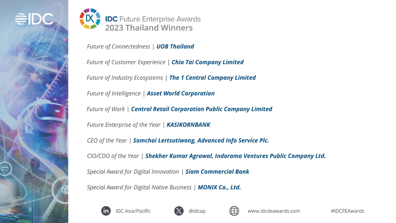“2023 is an amazing year for future-forward organizations in Thailand. The digital initiatives implemented by the nominees, finalists, and winners are proof of the Thai organizations’ commitment ensuring customer centricity as their core business strategy. Furthermore, IDC is also excited to note an unparalleled elevation in the quality of entries, reflecting the rise in digital innovation initiatives across the Asia/Pacific region. This underscores the growing digital maturity, as an increasing number of Future Enterprises take bold steps, embracing emerging technologies to enhance resilience, ignite growth and effectively participate in the digital business era,” ends Sivalingam.