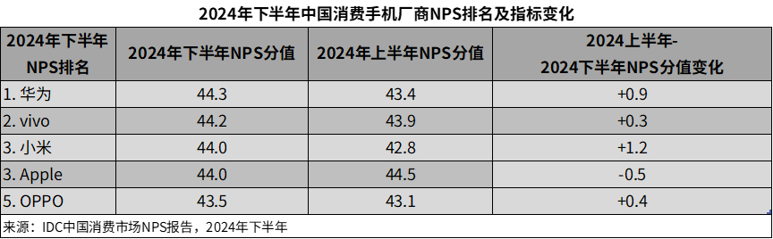 OPPO在2024年下半年间NPS有小幅提升,在消费者关注度最高的AI领域,OPPO获得了用户的积极评价。在“AI功能智能易用”与“AI语音助手使用体验好”等指标中,OPPO维持了领先地位。